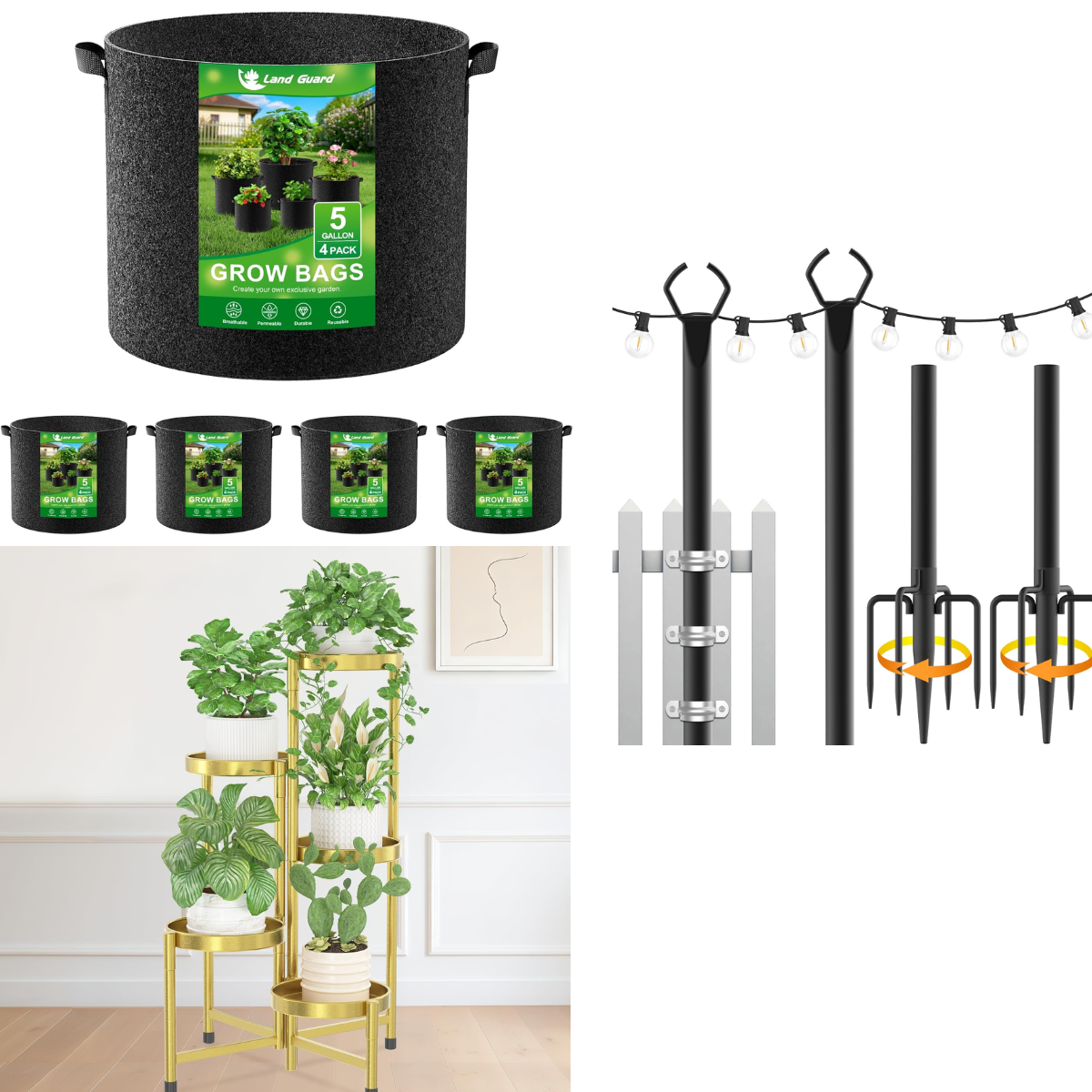 2-pk light poles, $18+ | 4-pk grow bags, from $5+ | Gold-toned plant stand, $35+