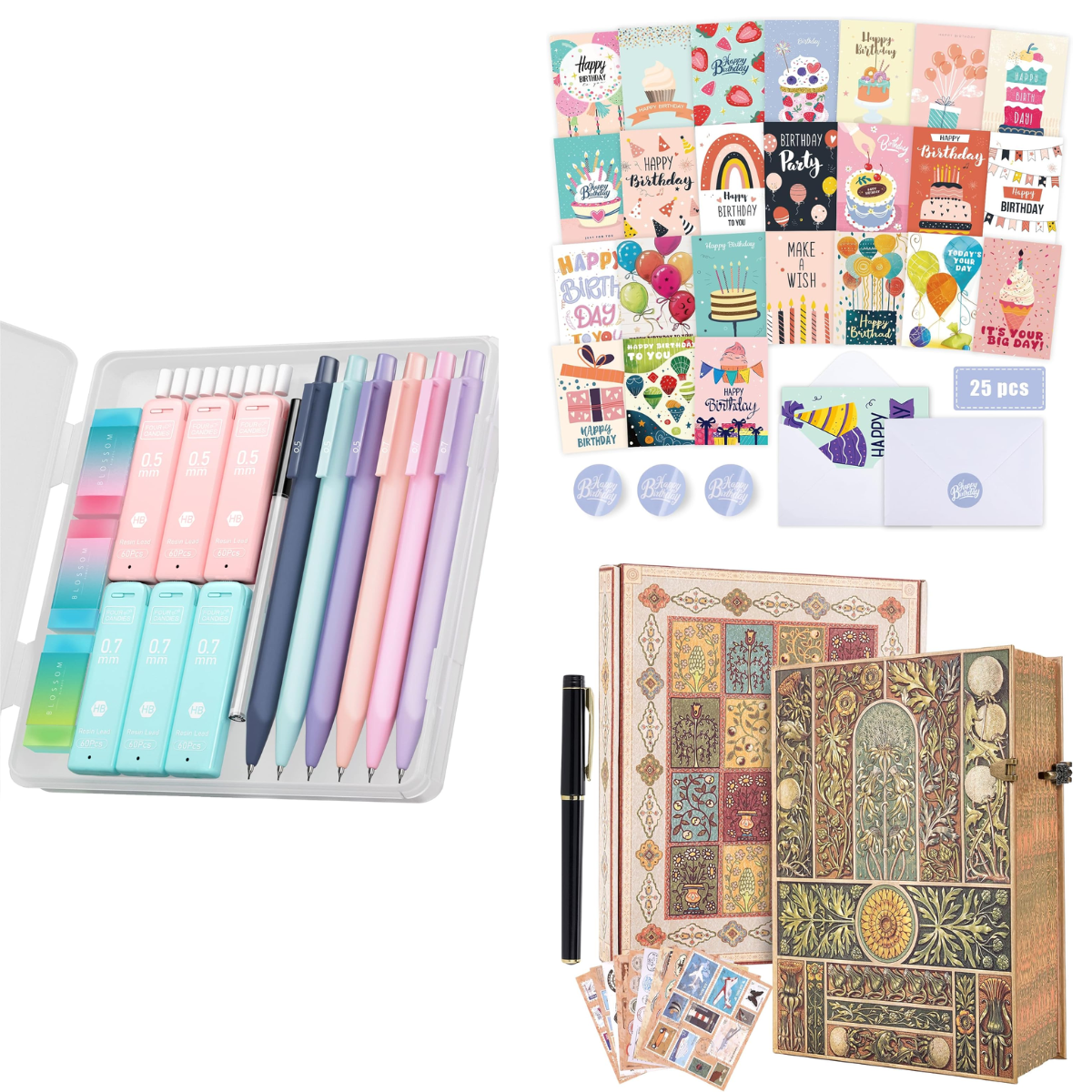 Pencils set, $6+ | 25-pk birthday cards, $5+ | Journal, $11