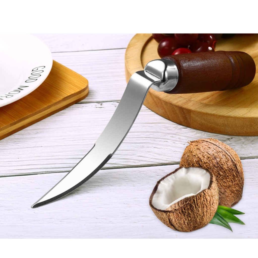 This coconut tool set is super handy! I use it myself, and it makes removing the coconut flesh from the shell so easy. The stainless‑steel scraper is comfortable to grip and is designed to lift the coconut flesh cleanly. It has blunt edges and doesn’t hurt the fingers.