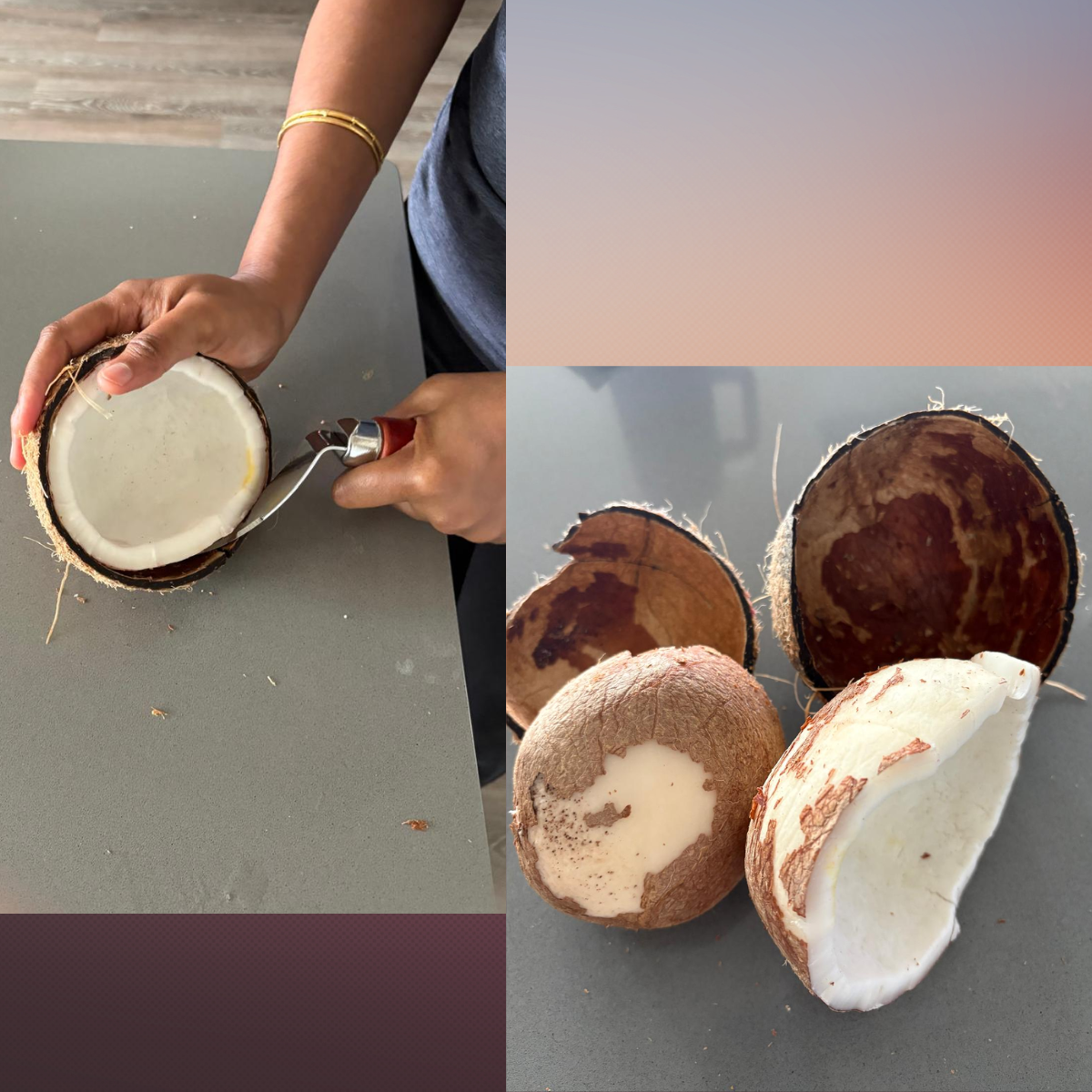 Pro tip: Freeze the shell for a bit, then let it thaw – the coconut inside pops out effortlessly. If you want it to thaw faster, I pop it into the Instant Pot and pressure cook for 0 minutes, then release the pressure. Works like magic!!