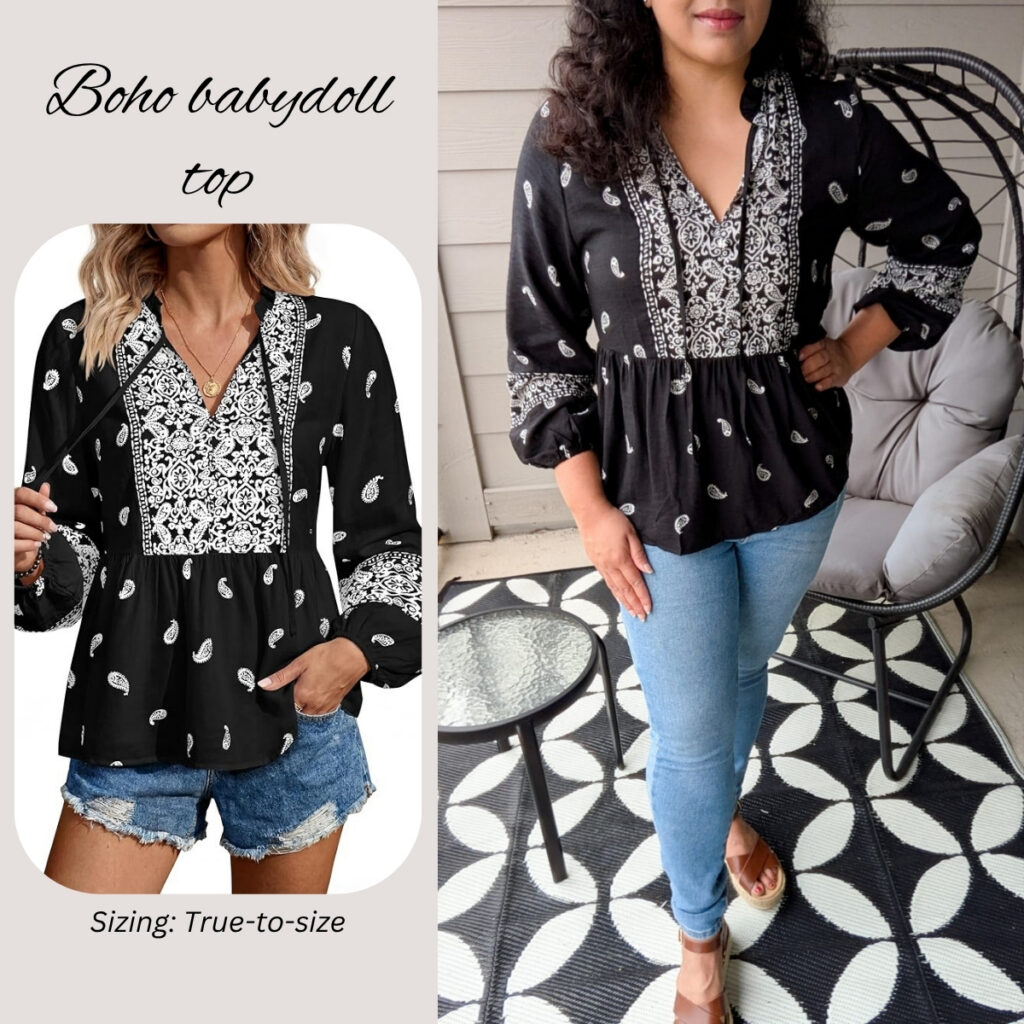 I grabbed the black color & I’m obsessed with how this top looks on me. It totally brings back my college‑era fashion vibes. The long sleeves give me some sun protection while the viscose‑blend fabric keeps things cool. It also has ties at the neckline, but I personally like leaving them undone for a relaxed look.
