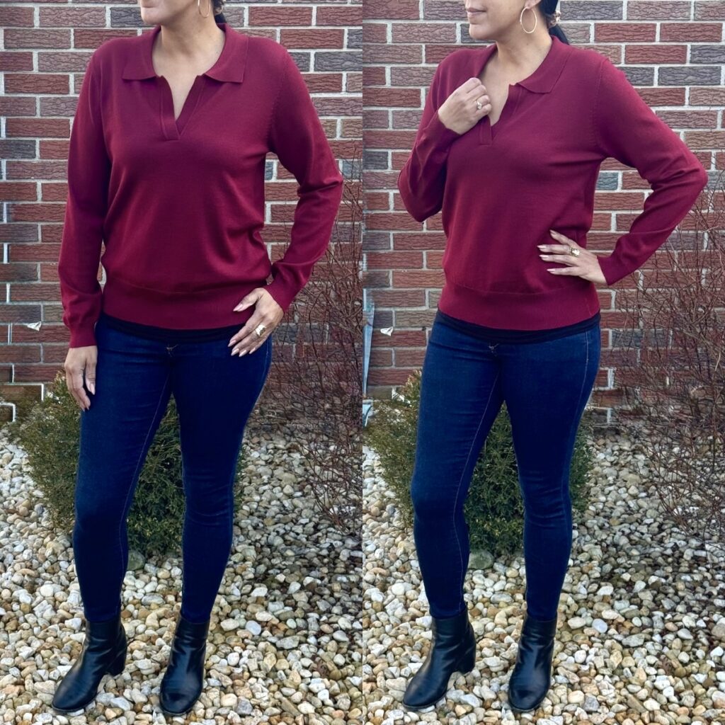 I love the versatility of this sweater. It’s a lightweight knit pullover with a tailored look. It’s perfect to pair with trousers for the office or jeans for a casual everyday look. Choose from 25 colors! I am between size Small & Medium and the size medium worked best in this.