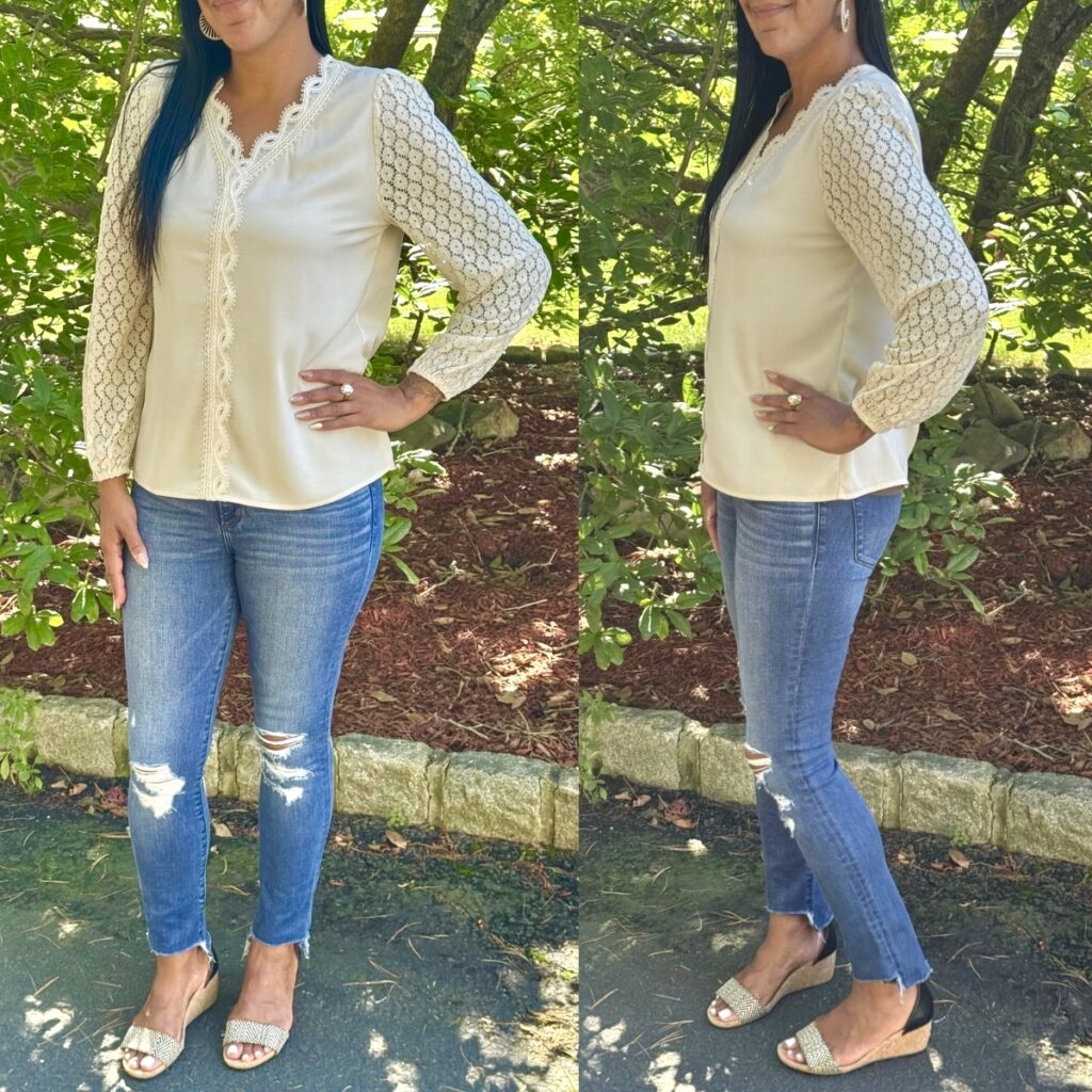 This blouse has such pretty details! It has a delicate lace trim around the neck and front center. Plus pretty lace sleeves. It looks great with jeans for a night out or paired with a blazer for work. It fits true to size. I am wearing a size Small & weigh 145 lbs.